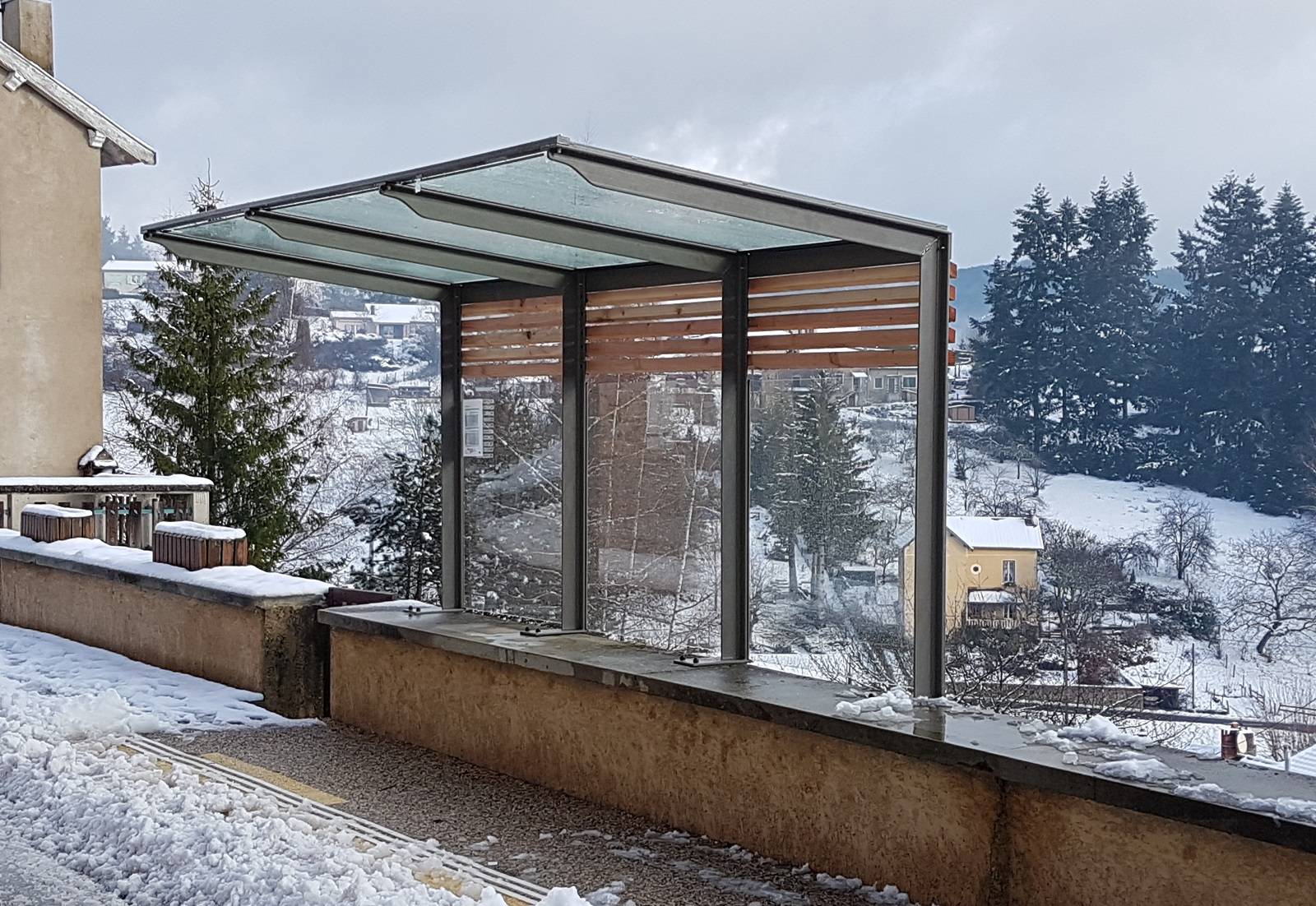Nous avons dans cet exemple d'abri un mariage réussi entre l'acier, le verre et le bois local, ce qui donne un rendu moderne et épuré.