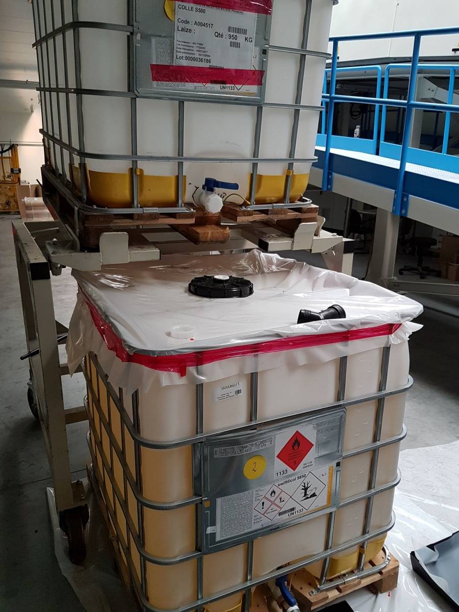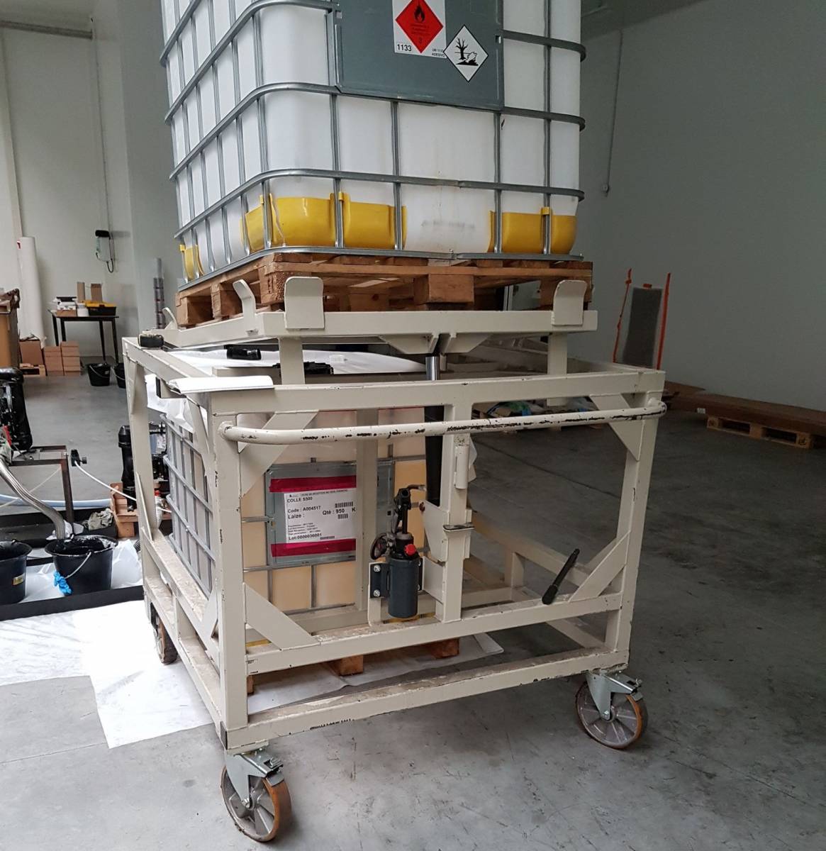 Dans ce cas de figure, nous avons fabriqué un chariot pour porter une cuve de solvant et permettre de stocker une autre cuve dessous afin de gagner en place. L'inclinaison de la plateforme supérieure permet de vider totalement la cuve de solvant. Cette manipulation se fait grâce à un vérin pneumatique manuel.
