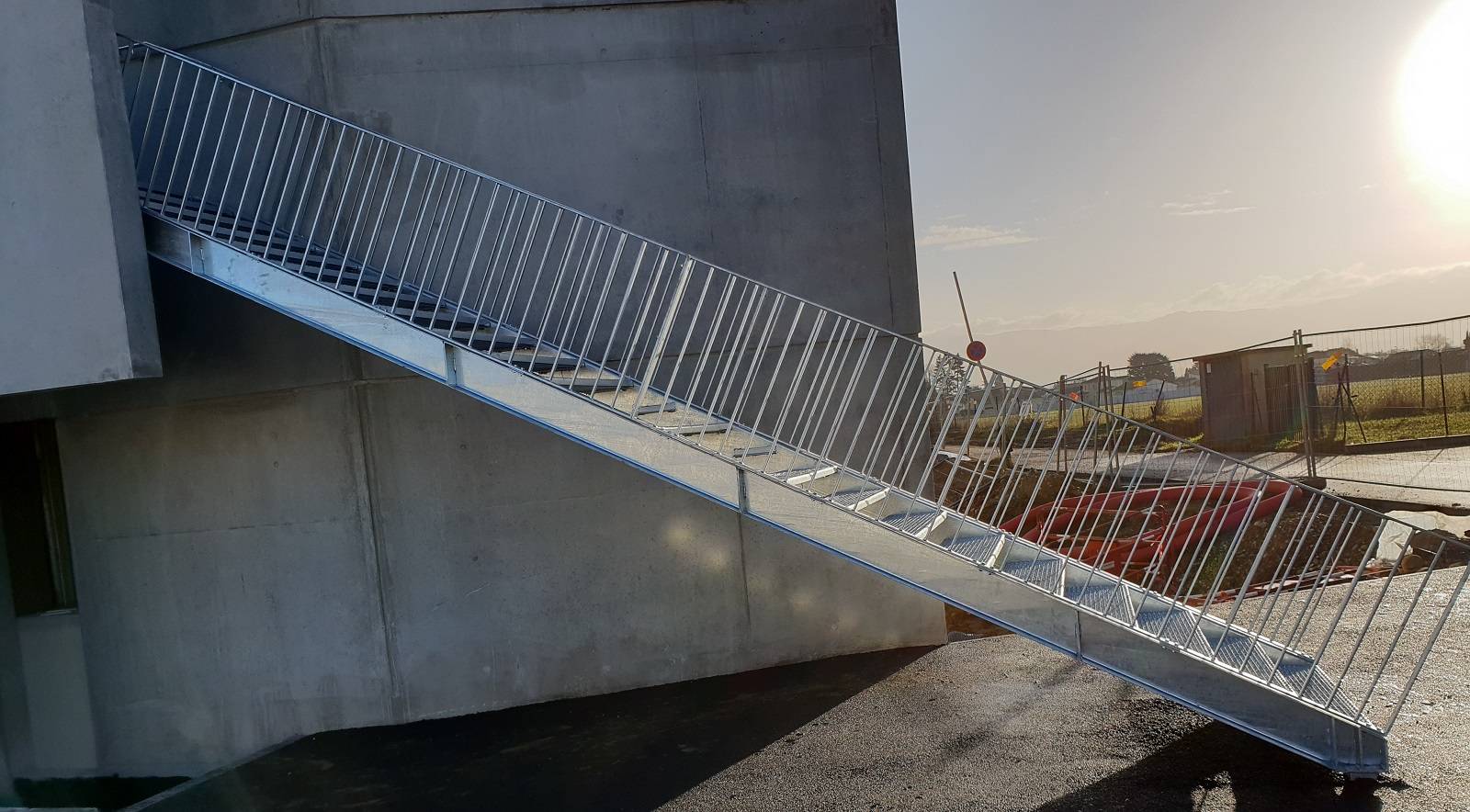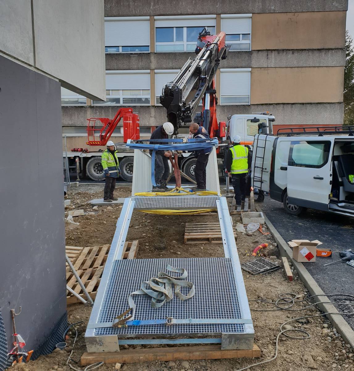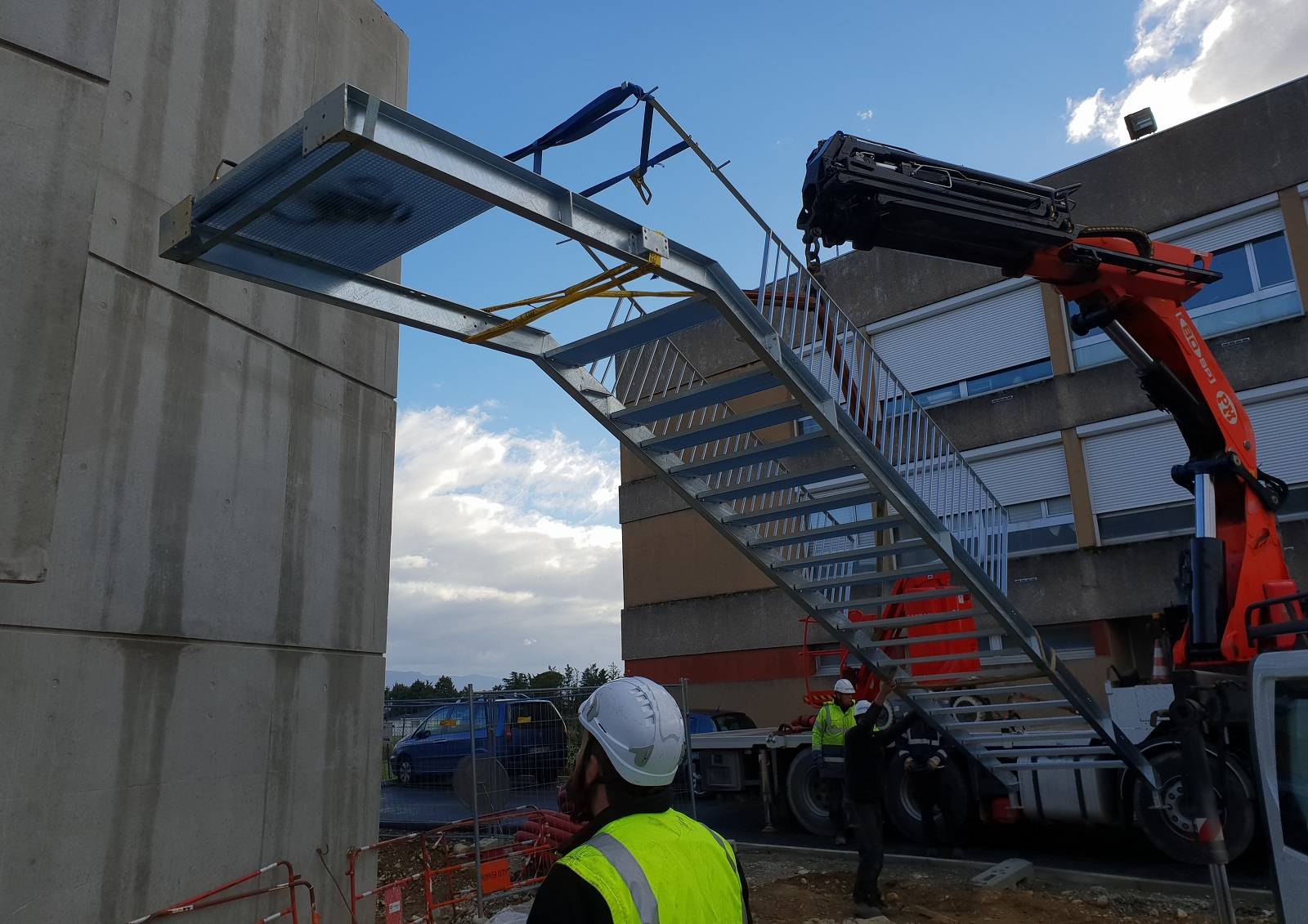 La pose de l'escalier a été réalisée grâce à un camion grue pour une réactivité plus importante, une sécurité accrue et une pénibilité moindre pour les salariés. Plusieurs solutions techniques ont été trouvé pour fixer des limons en tunnel dans un espace restreint.