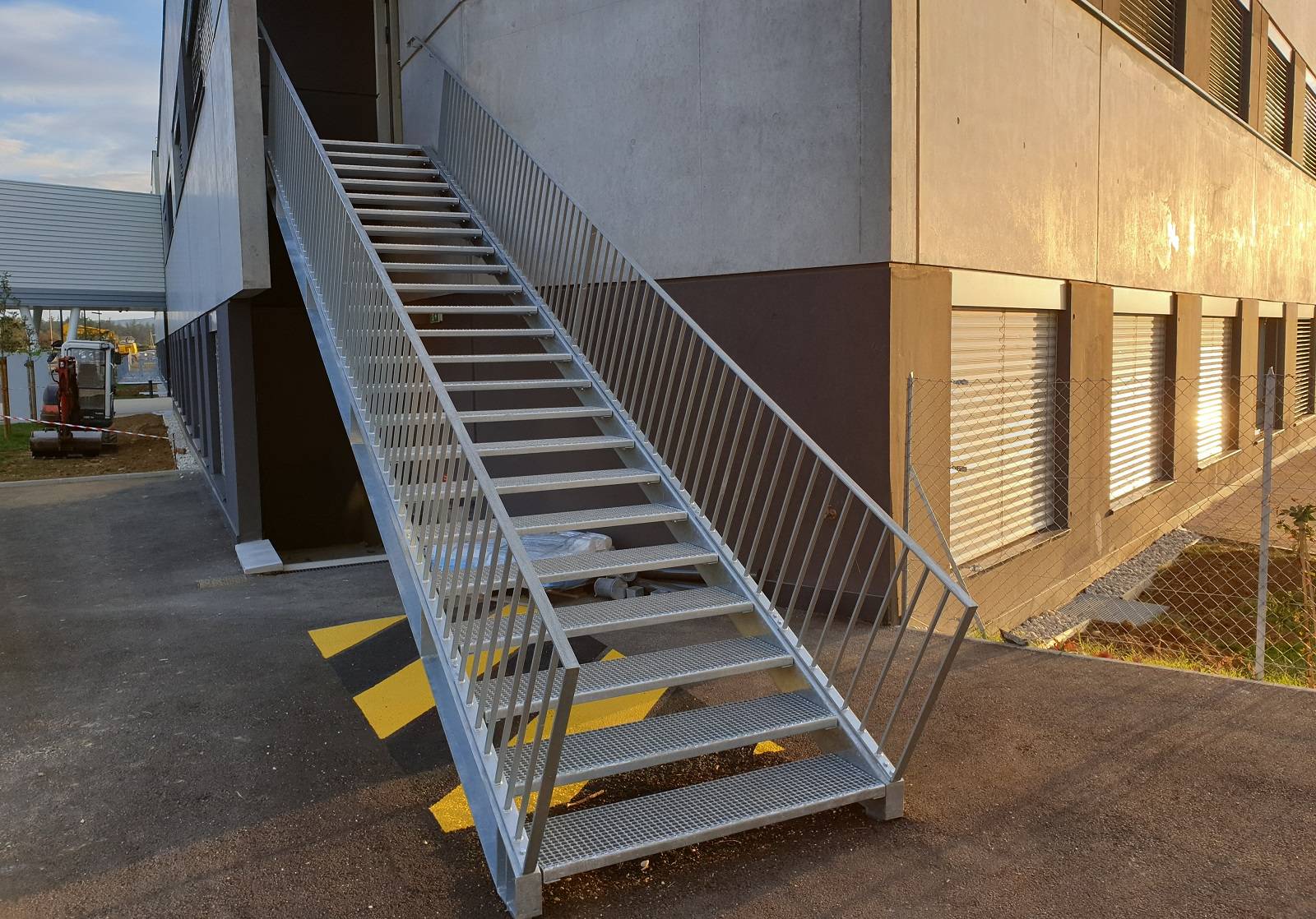 La structure est en acier plié, renforcée, avec des marches en caillebotis à maille étroite avec un palier supérieur.
