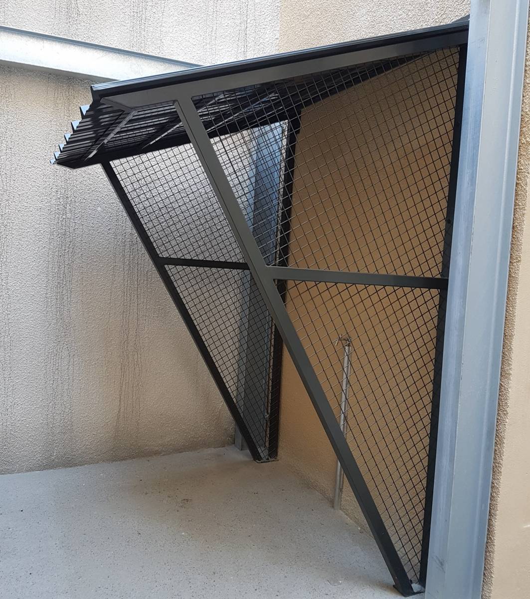 La structure est en acier tubulaire grillagée et thermolaquée pour soutenir un bac acier thermolaqué 2 faces. Des fixations ont été posées sur toute la hauteur pour un effet de déport de la toiture.